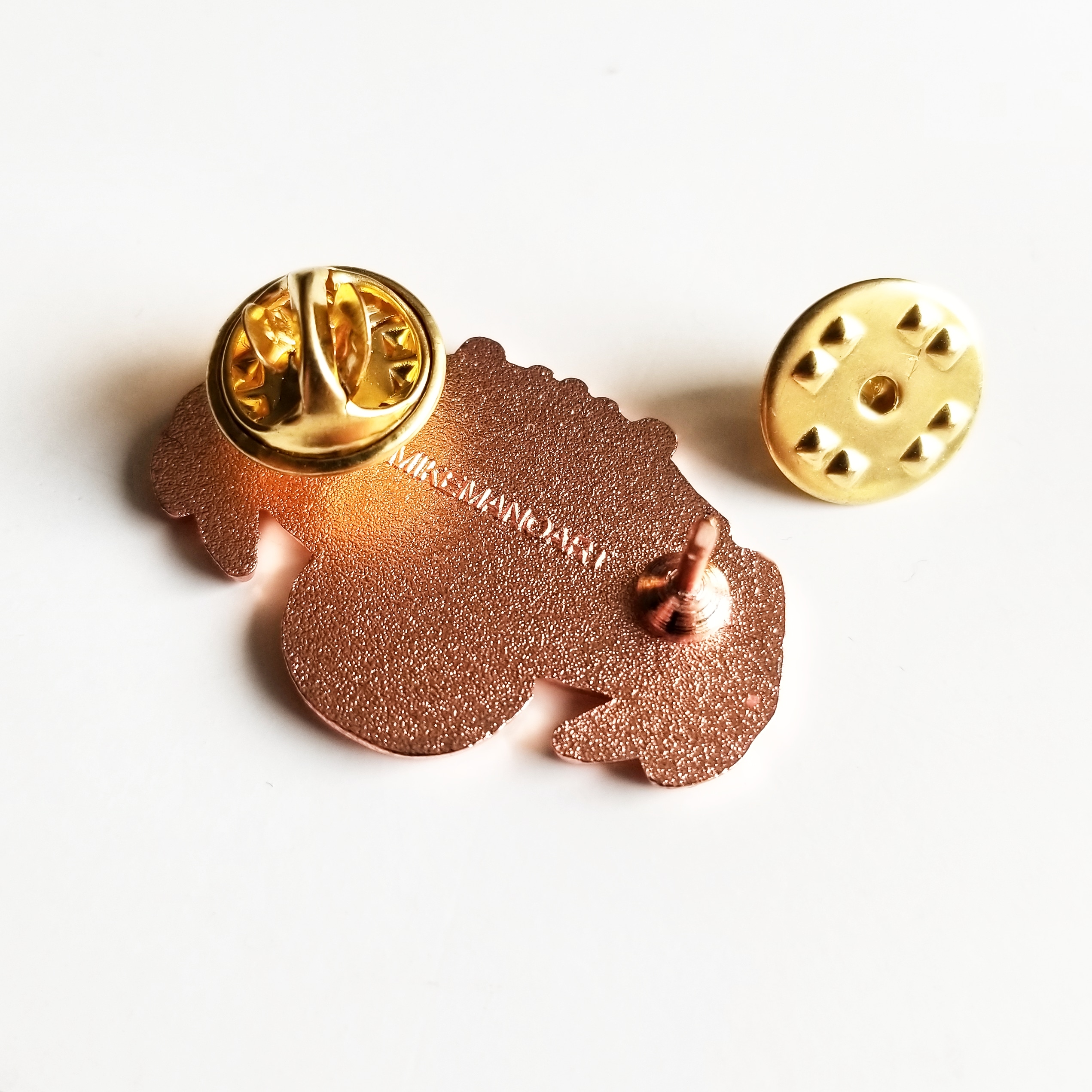 Hard enamel pin cast in rose gold metal, 5 color enamel. Includes locking pin backs.